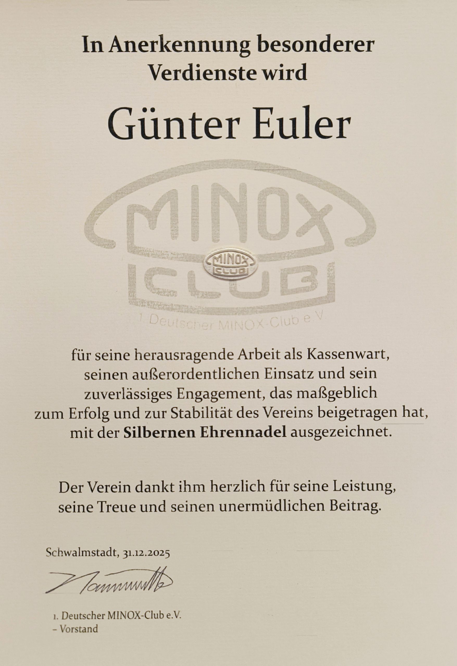 Wir danken Günther Euler für sein langjähriges und überdurchschnittliches Engagement im Verein. Seine herausragende und stets zuverlässige Arbeit als Kassenwart hat unseren Verein nachhaltig geprägt.